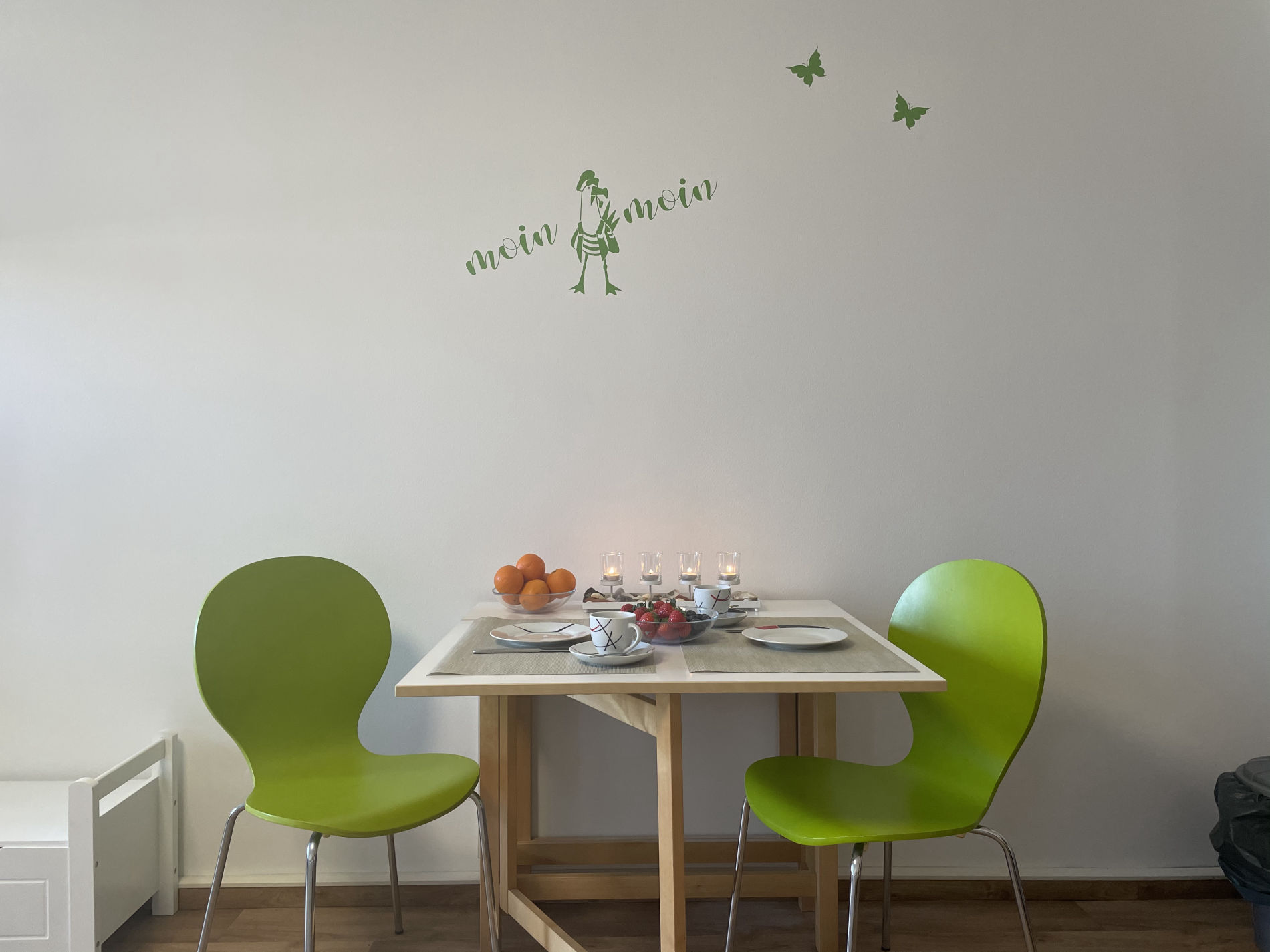 Unser 38 m² großes Appartement „Backbord“ ist barrierearm mit dem Aufzug oder über das Treppenhaus zu erreichen. Es bietet einen gemütlichen Wohn und Schlafbereich mit TV und einem komfortablen Bett sowie einen bequemen Essbereich. WLAN ist hier selbstverständlich ebenfalls verfügbar. Ebenso gibt es einen Balkon mit herrlichem Blick über die Probstei, auf dem Sie die angenehme Brise der nur 700 Meter entfernten Ostsee geniessen können. Hinter einer Trennwand stehen für die kleinen zwei Schlafplätze in einem Doppelstockbett zur Verfügung, sodass auch für sie der Aufenthalt zum Erlebnis wird. Eine Pantryküche bietet die Möglichkeit, sich selbst zu versorgen und das Badezimmer mit Dusche und WC rundet die Einrichtung ab. Im Flur direkt gegenüber liegt unser zweites Appartement „Steuerbord“, das ebenfalls buchbar ist.